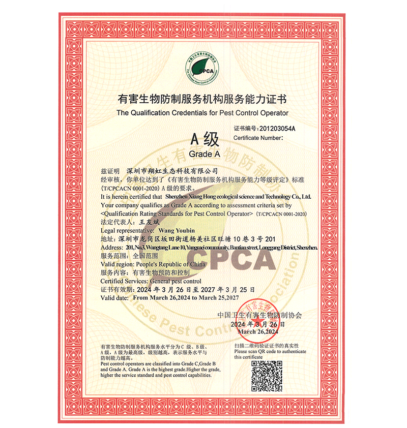 深圳市翔虹生態科技有限公司成立于1995年,是深圳最早成立的專業蟲害防治公司之一。公司發展至今獲得全國有害生物防制服務A級資質、廣東省有害生物防制服務A級資質、深圳市有害生物防制服務A級資質、廣東省有害生物防制服務A級資質、深圳市有害生物防制服務甲級資質的單位,是中國有害生物防治協會會員、廣東省有害生物防治協會會員、深圳市有害生物防治協會理事單位,多次獲得“深圳市十佳消殺單位”榮譽。